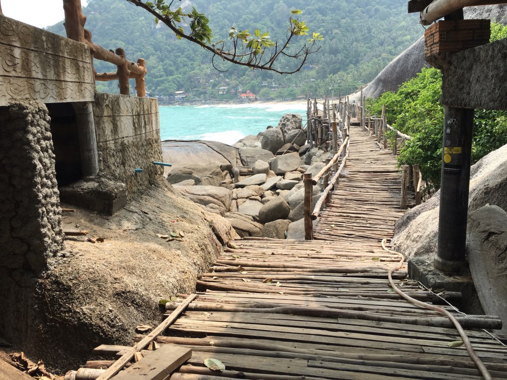 For the next seven days, I hung on the beach with a bunch of Burning Man vets and topless Europeans. I did yoga and got a massage almost everyday. One day I traversed a bunch of branches nailed together (pretending to be a bridge) to the neighboring beach, Haad Yuan.